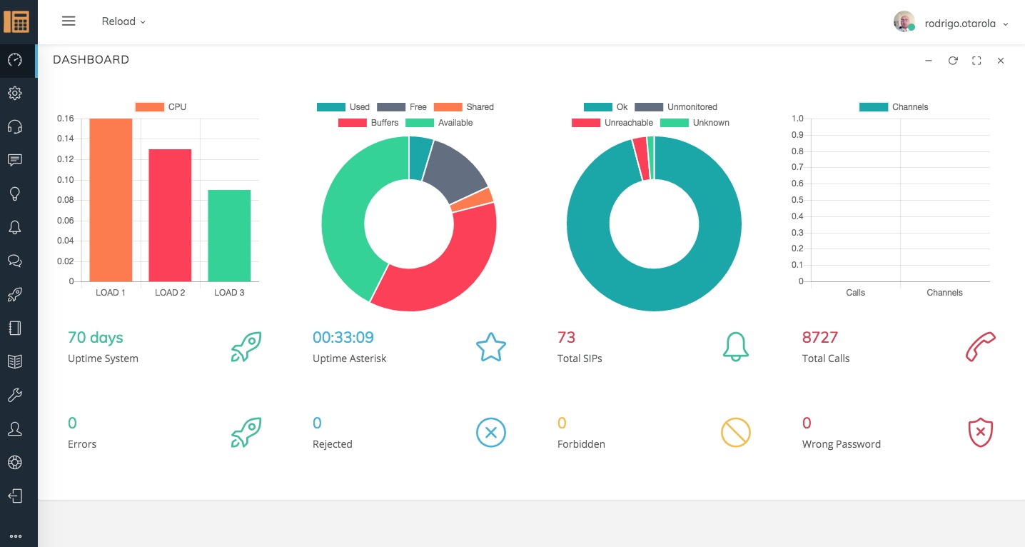Panel de monitoreo del sistema el cual nos permite ver el uso de CPU, RAM, Cuentas SIP, Canales, Errores, Uptime Asterisk y Sistema.
