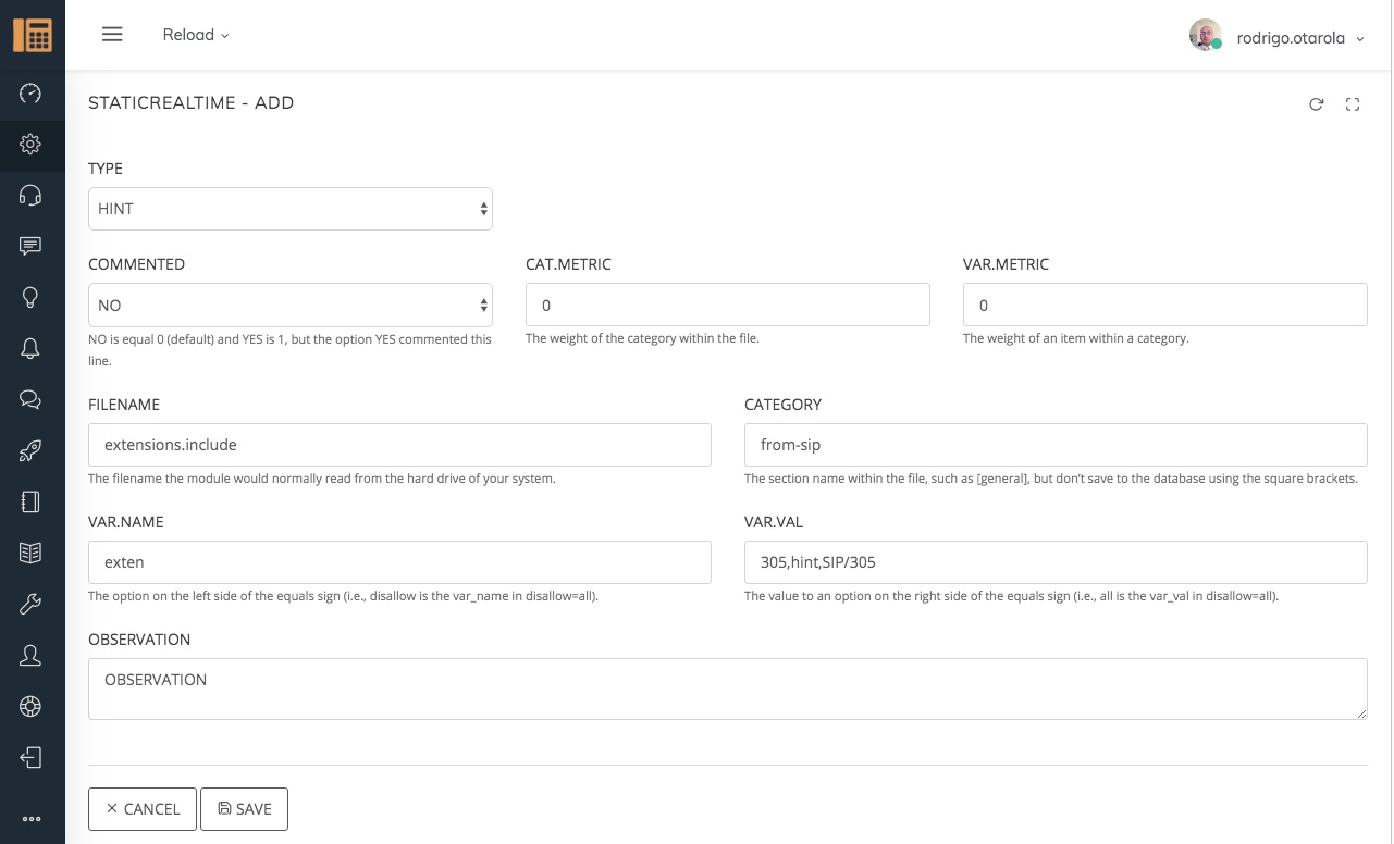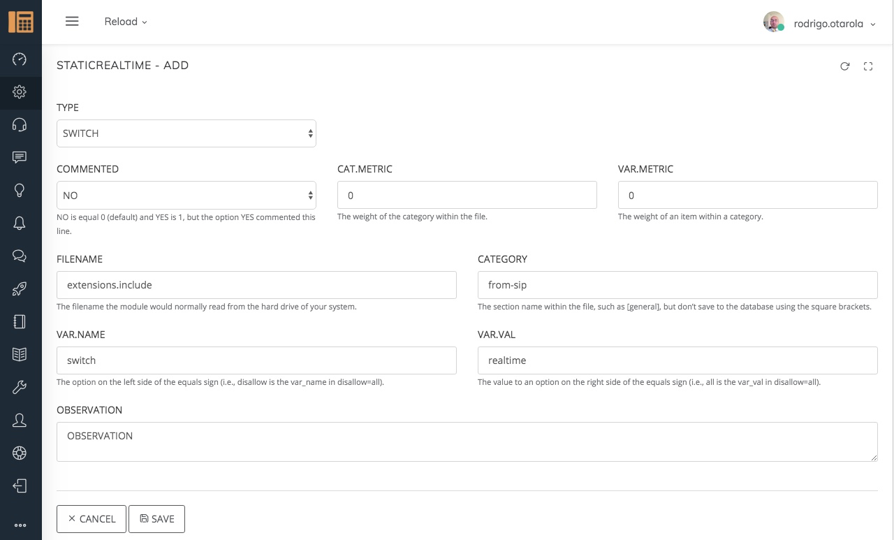 El formulario de creación permite crear las reglas de Static Realtime utilizando los mismo parámetros en se mencionan anteriormente en Asterisk.